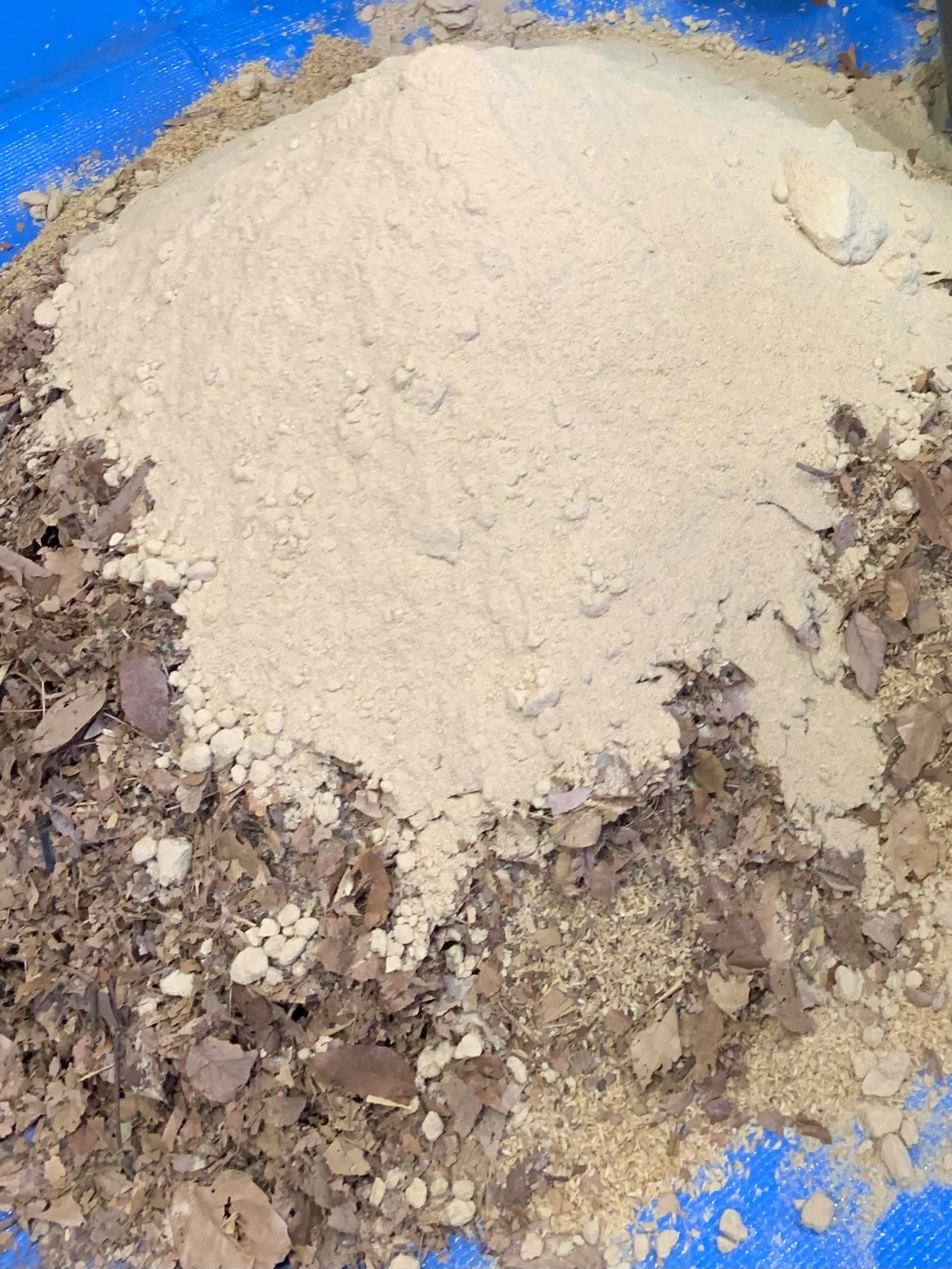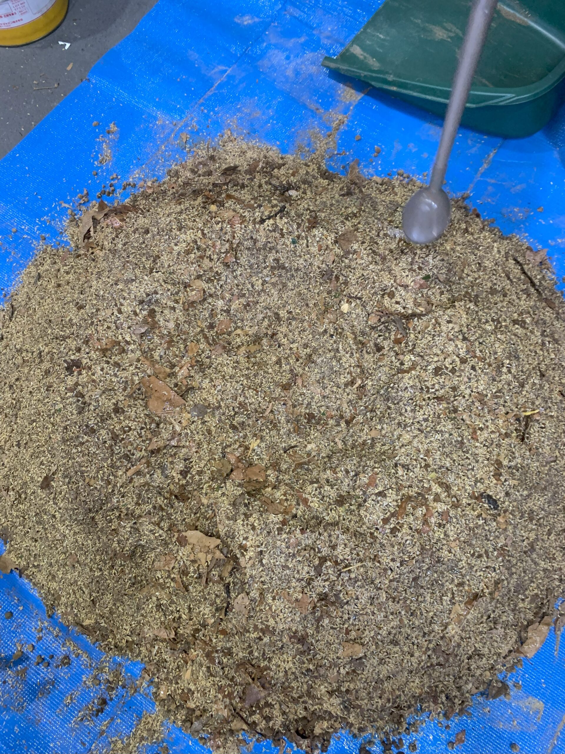 もみがら、落ち葉、米ぬか、バークチップ、鶏ふん、赤玉土を使用した堆肥で